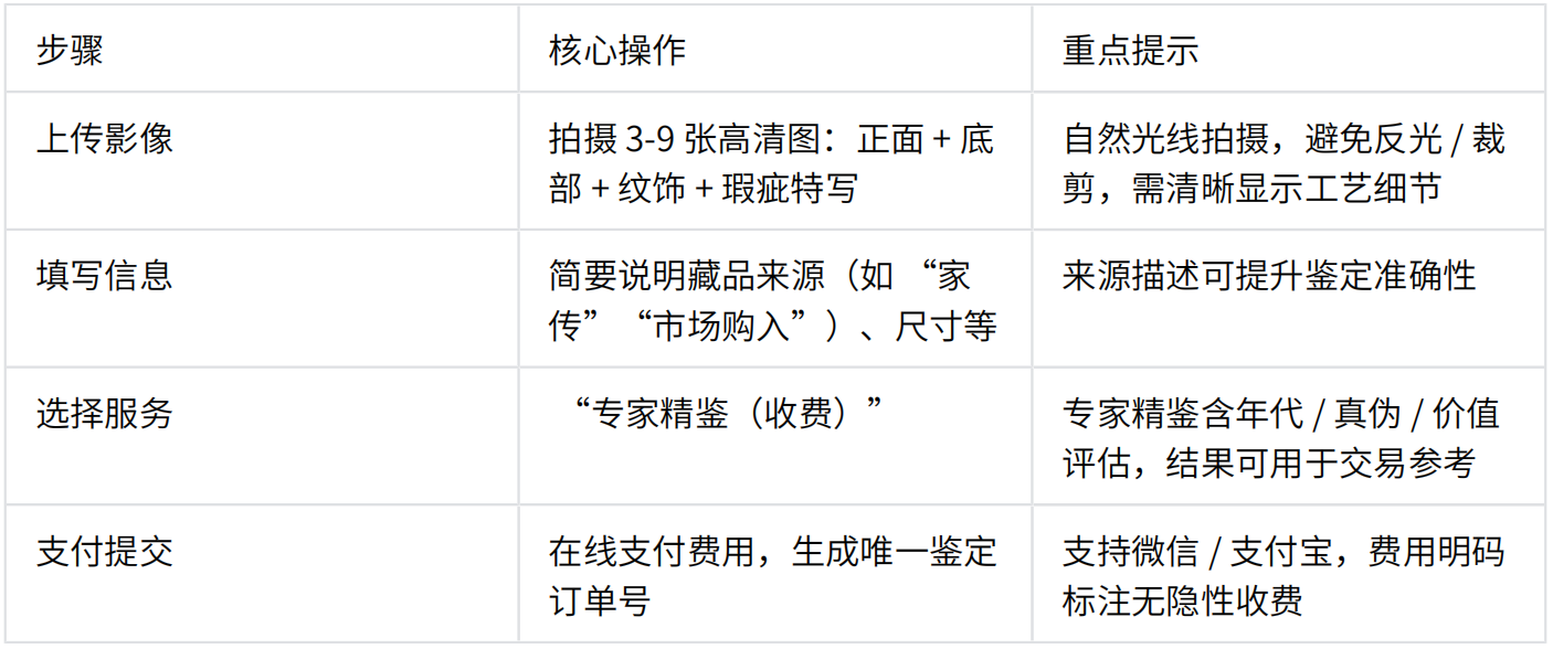 重要提醒:出土文物、国家禁止交易品类不予鉴定,提交即视为确认藏品来源合法。